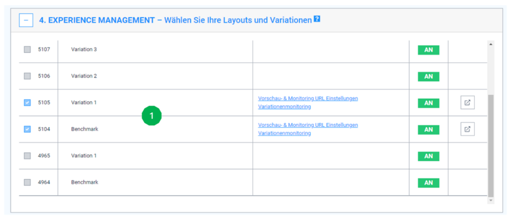 Under ‘Experience Management’, we can assign the individual variants to the triggers we have selected. In our example, we have selected the standard page (benchmark) and variant 1 (see Fig. 1).