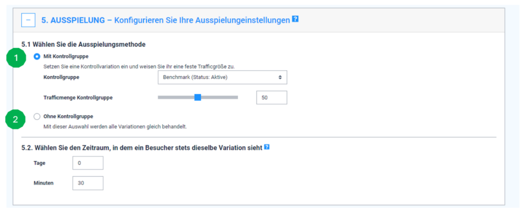 - Benchmark project with a control group (Fig. 1): Here you can direct a certain, configurable percentage of visitors to your standard landing page. The remaining visitors are divided between the different variants. Please note that the optimization only affects the percentage that is allocated to the variants. As a rule, the option with a control group is selected at the start so that it is clearly measurable what effect personalization has compared to a simple static landing page.