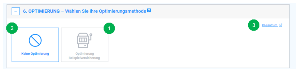 - AI-controlled optimization (Fig. 1): Select this option to have your variants played out by an intelligent algorithm. This algorithm continuously learns from customer interactions and sales, in our example lead generation for travel insurance, in order to constantly improve the performance of your landing page. If you choose this option and want to start directly with an AI-optimized playout, please click on “AI center” (Fig. 3) at the top right and continue with point “6 Use artificial intelligence for personalization and conversion increase” and then return here.