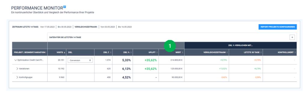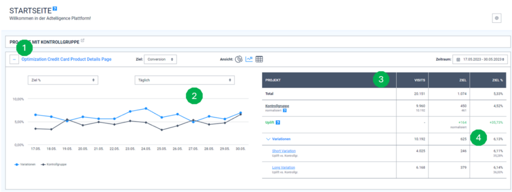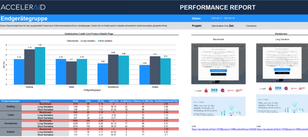 If we have selected “A benchmark project with control group” in section 5.5, the control group as well as the personalized variants are displayed (see Fig. 2). Otherwise, you will see all the data for the variants and your standard page one below the other.