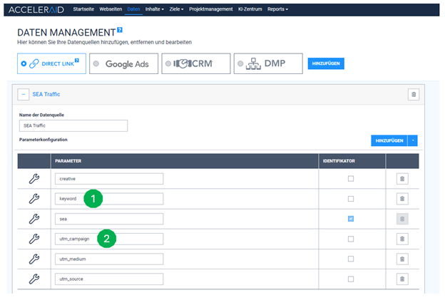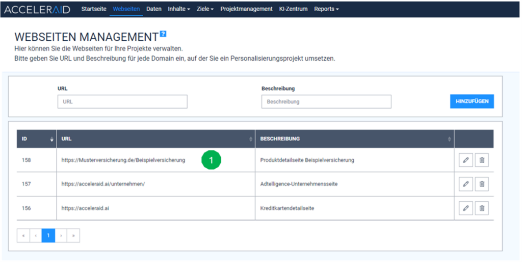To achieve this, we must first enter the URL of the desired landing page, in our case https://musterversicherung.de/beispielversicherung, under ‘Websites’ in the ACCELERAID platform (Fig. 1) and save it.
